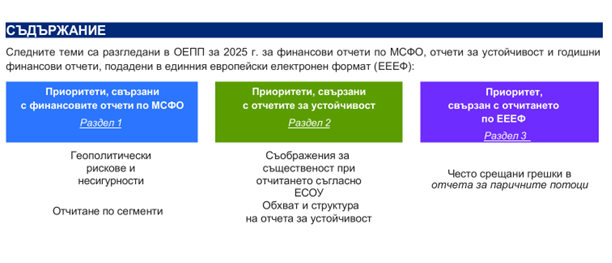 В публичното изявление са посочени общите европейски приоритети за прилагане (ОЕПП) на финансовите отчети за 2025 г., които включват следните основни теми: